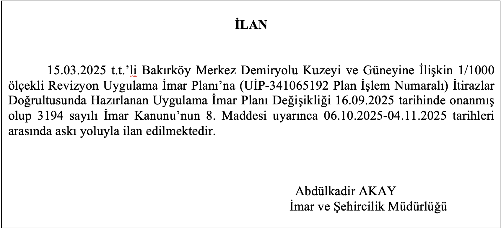 Askıdaki imar planı değişikliğine https://keos.bakirkoy.bel.tr/keos/ web sitesinden ada/parsel bilgilerinizi yazarak ulaşabilirsiniz.